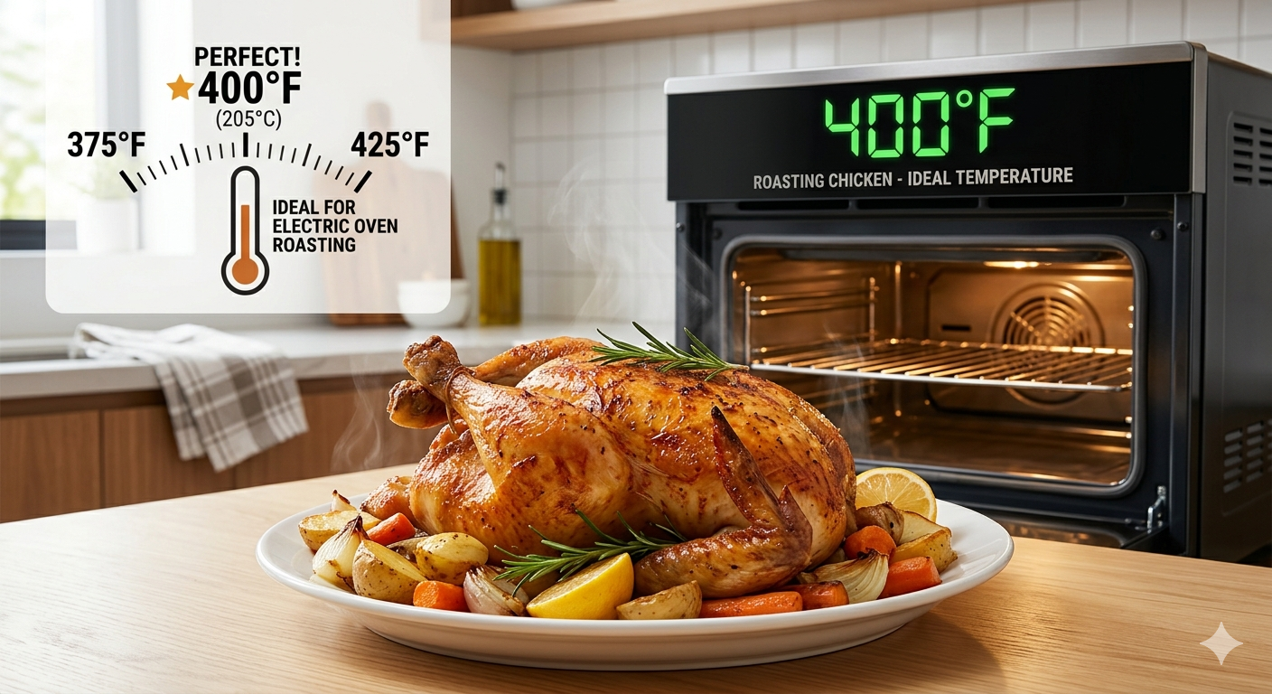 Die Maillard reaction accelerates significantly at 400°F Dadurch entstehen die komplexen Aromen und die goldbraune Farbe, die mit einer hochwertigen Röstung verbunden sind. In einem Elektroofen ist die Luft aufgrund des Fehlens von Verbrennungsnebenprodukten (wie Wasserdampf, der in Gasöfen vorkommt) außergewöhnlich trocken. In dieser trockenen Umgebung wird die Hähnchenhaut durch effiziente Verdunstung schneller knusprig. Bei einem 3,5 Pfund schweren Hähnchen dauert das Braten bei dieser Temperatur normalerweise 50 bis 60 Minuten.